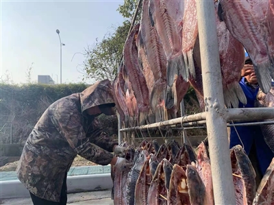晒场上,第一批青鱼干已经挂满了晾晒架,在冬日暖阳下呈现出诱人色泽。连日来的好天气使得腌料的芳香充分渗入,与鱼肉的鲜香交织在一起,让青鱼干愈晒愈美味。一旁的老师傅们正在洗净处理腌好的青鱼,麻利地串上签子,最后把鱼肉挂上架子来个“日光浴”。