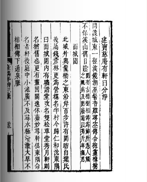 北城外兴龙桥之东,沿岸百步许,有园,昉自叶氏,后属钱彦林,更为营构,名“半村”。今归仁和沈东隅,曰“面城”。园内有旷谐堂,改名“双松草堂”。秀月轩则名犹旧也。更有画因阁、逸休斋、妙寻轩,俱东隅命名者。轩后庭中小池,广不及寻,水极澄澈,大旱不枯,相传下通泉脉。