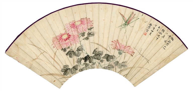那天,我也拿出了杭静琴的扇面请大家欣赏,只见画面设色淡雅,描绘了三丛菊花和一只在花间欢快跳跃的蚱蜢,野趣横生,题记“仿新罗山人笔意以应郎秋先生正之。丁亥仲夏静琴写”,钤白文“杭清”印。张舫澜先生说,杭静琴的画倒有吴湖帆一路的风格,可能当时在上海拜了不只黄宾虹一人为师。南京的家搬家时,杭静琴的两箱画遗失。我手上这件上款的“郎秋先生”有可能是民国时期嘉善的中医罗朗秋,他在嘉善城内戴家池六号开设诊所,虽不能断言一定是他,但可以肯定的是杭静琴参与平川金石书画社活动,与嘉善文友交往时留下的作品。