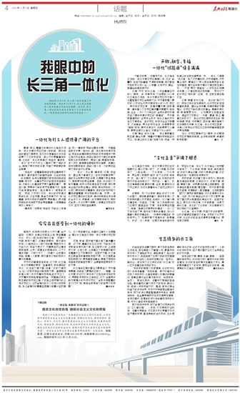 长三角地区是我国经济最具活力、开放程度最高、创新能力最强的区域之一。随着一体化发展,我们不仅感受到了这些日新月异的变化,更期盼未来的长三角地区,成为“全国贯彻新发展理念的引领示范区”“全球资源配置的亚太门户”和“具有全球竞争力的世界级城市群”。 ■钟迪良
