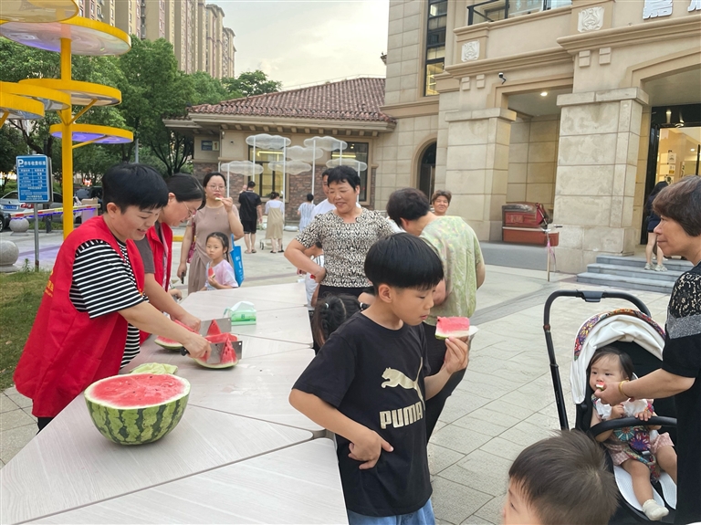 此外,现场还有免费西瓜品尝,居民们参加或观看比赛之余还能吃到爽口的西瓜。