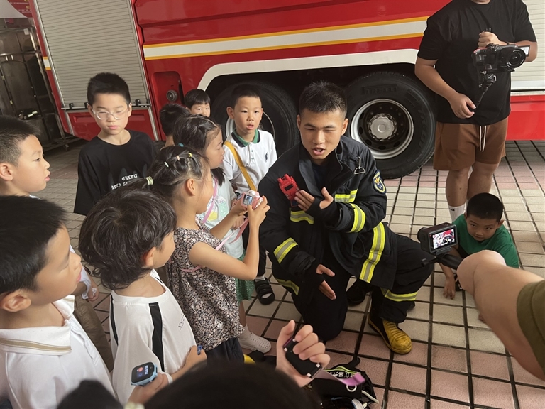 现场,消防员叔叔还展示了怎样穿戴消防救援的服装和设备。消防员叔叔说,光这一身就要30多公斤重,快赶上一个小朋友的重量了。而他们要穿着这样的一套服装去火场执行任务,真的不容易。小记者梅筱瑜看着消防员脱下装备后湿漉漉的背说:“穿装备感觉有点热的,他们工作很辛苦的。”