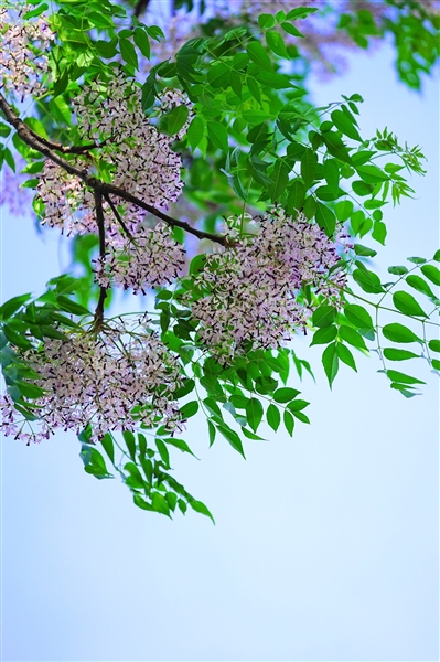 “五一”节前的一个中午,我在县城中山路与马路口桥附近的滨河绿道散步时,不经意间举目朝市河南岸望了望,看见南岸香樟树边上竟有一棵硕大的苦楝树。那苦楝树有着宽而高的树冠,已高过了它旁边的楼房。苦楝树密密的树叶间,开着丛丛紫白色的小花,那数不清的花丛在周边香樟树的衬托下显得分外壮观,树冠上紫白色的花丛如同绚烂的晚霞,又好像是天上落下的团团雪花,或是一团晕染的紫雾,轻轻柔柔。王安石有诗说:“小雨轻风落楝花,细红如雪点平沙。”