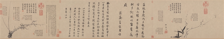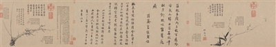 此图作为《雪中梅竹图》卷的跋尾辗转流传,大致经悟悦禅师、唐明远、张雨、袁泰、长洲郭氏、徐守和、吴舜升、安岐、内府收藏,高仪甫、钱曾或也曾收藏此卷,明末流出不少临仿本。全卷三段墨梅、数十段题跋自宋到清,洋洋大观,折射出“笔墨当随时代”的画风演变,也从中反映出元代江南文人的交流和明清收藏家的情况。